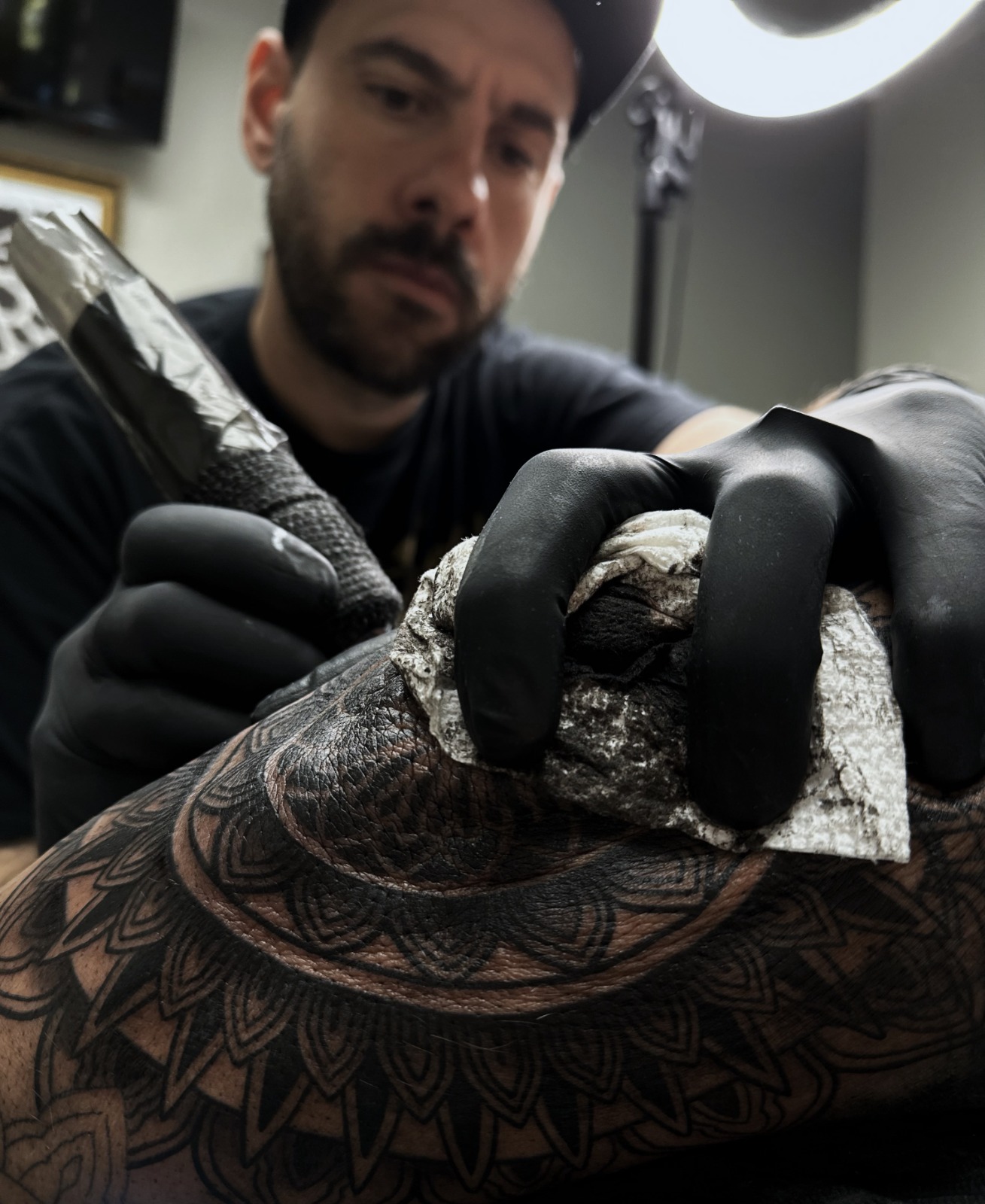 Com mais de duas décadas de experiência dedicadas à tatuagem, desde 2020 sigo criando meu estilo. Com beleza da tinta preta e focado no ornamental, uso grandes áreas em preto sólido ou texturizadas com padrões geométricos equilibradas com áreas vazadas que se conectam entre si por formas inspiradas em Art Nouveau e Deco de forma que valorizem a anatomia do corpo com linhas hora simétricas, hora orgânicas, brincando com a estabilidade das referências em arquitetura e a flexibilidade do corpo em uma constante dualidade.